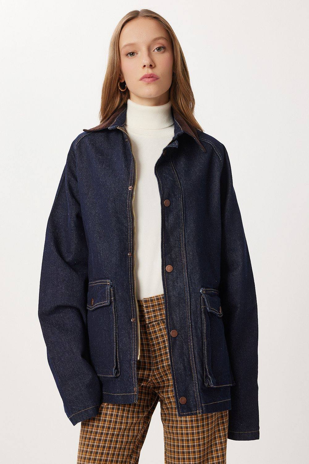 Stylish Navy Denim Jacket by Happiness Istanbul. Made from high-quality cotton, this jacket features a classic collar and button closure. Perfect for layering over a turtleneck for a casual yet chic look.