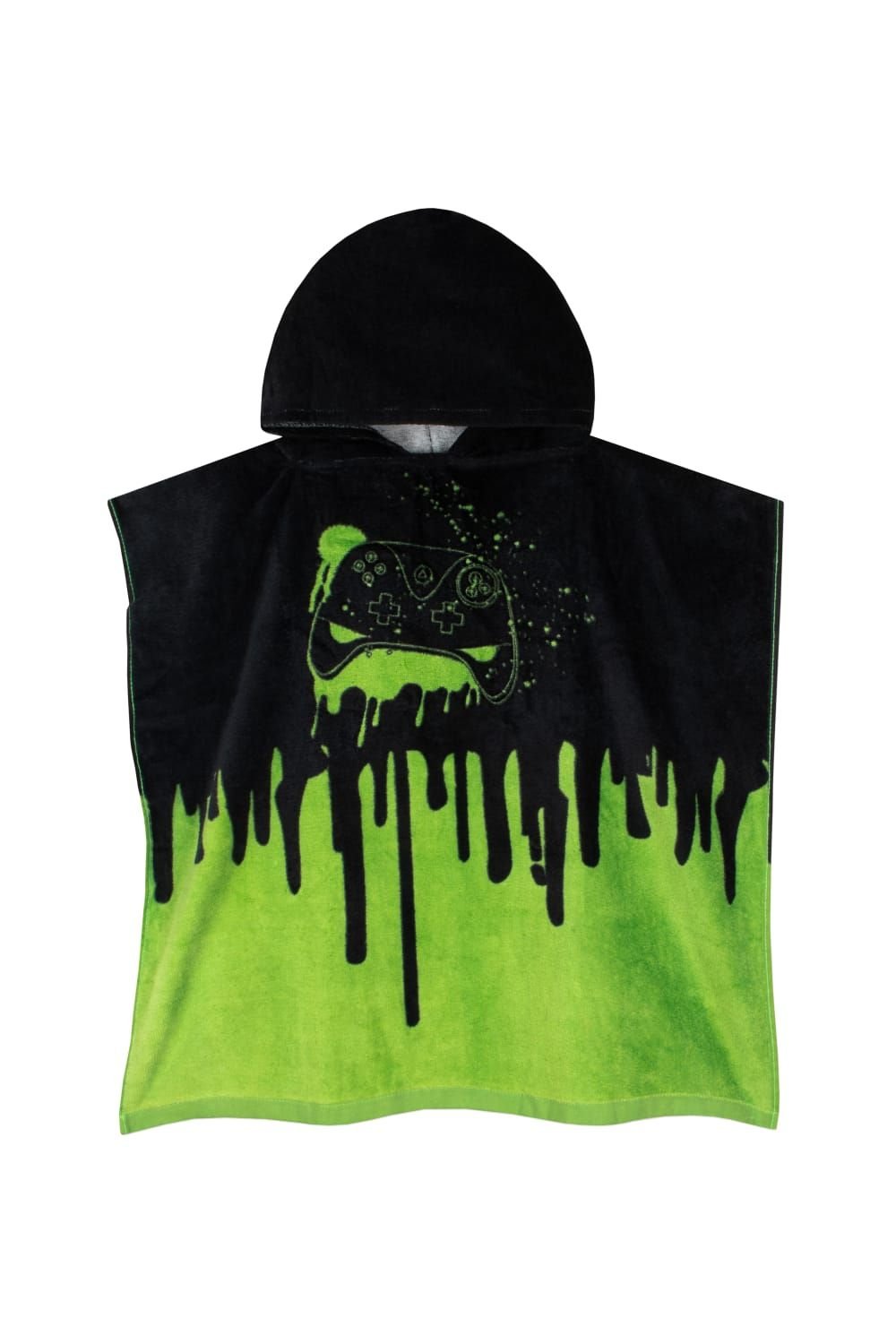 This hooded towel poncho is a fun and practical accessory for young gamers. Featuring a black top with a green dripping paint effect on the bottom, it adds a splash of colour to any beach or gaming setup. Made from soft cotton, it's perfect for drying off after a swim or a gaming session.