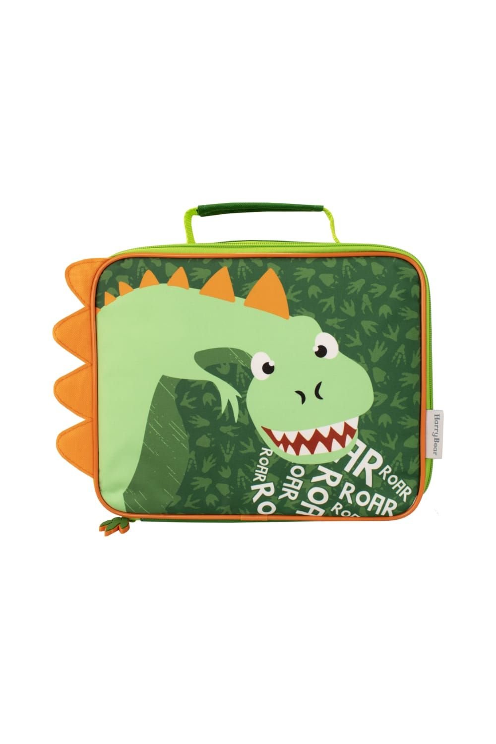 Cute dinosaur lunch bag by Harry Bear, perfect for little dino fans. Features a green and orange dinosaur with dino footprints. Made from durable rubber material.