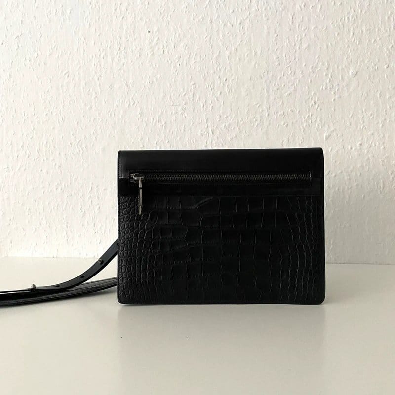 Stylish Helmut Lang black leather crossbag/clutch with a crocodile texture and a removable shoulder strap. Compact and elegant, perfect for evening events or casual outings.