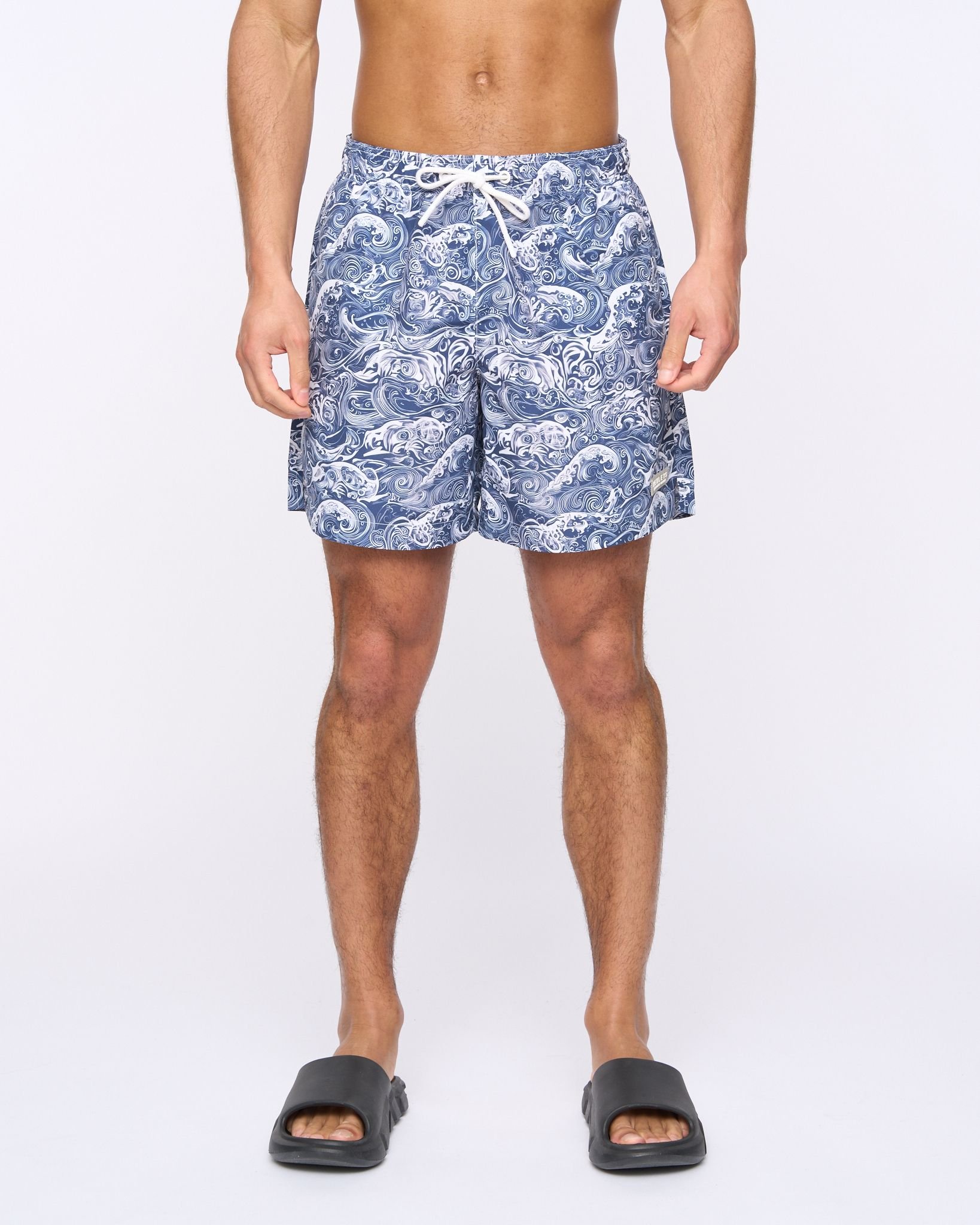 Classic swim shorts designed for simplicity and comfort. Featuring a navy wave print, these shorts are perfect for beach outings or casual wear.
