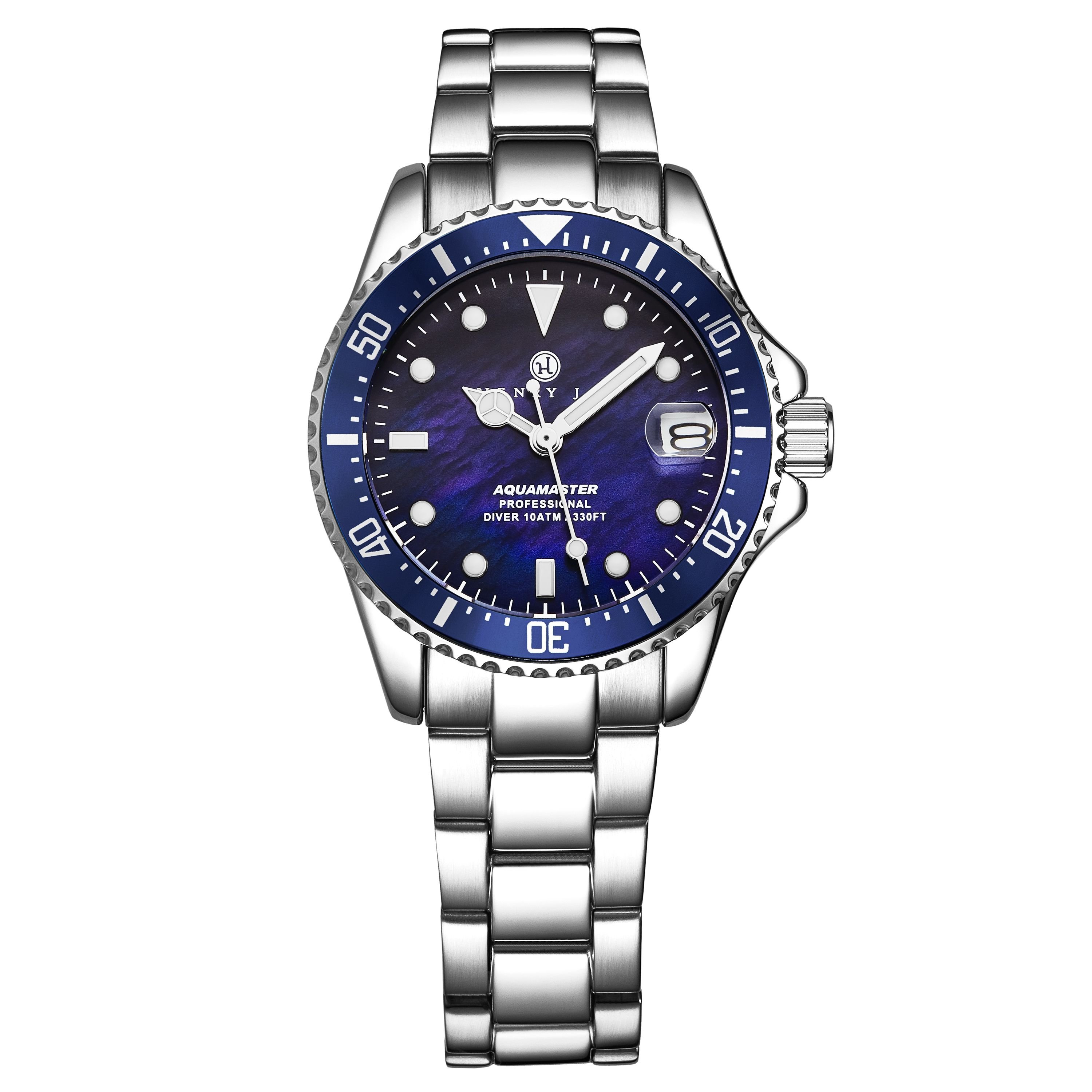 Elegant light blue mother-of-pearl dial watch with a stainless steel band. Powered by a quartz movement for precise timekeeping. Ideal for everyday wear and special occasions.