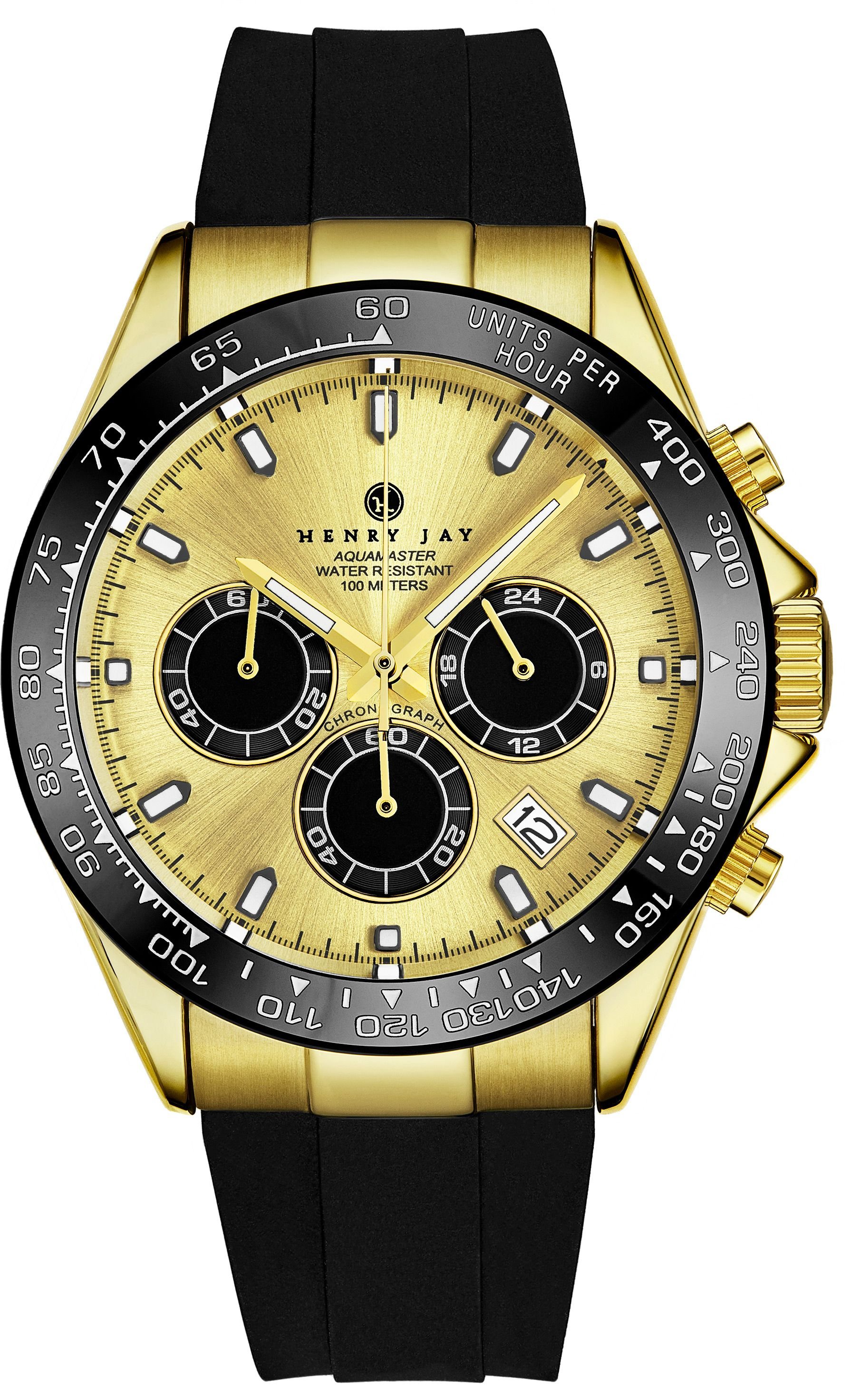 Stylish Henry Jay quartz chronograph watch with a gold-tone case and black rubber strap. Features a luminous hands and 100 meters water resistance, perfect for both casual and adventurous wear.