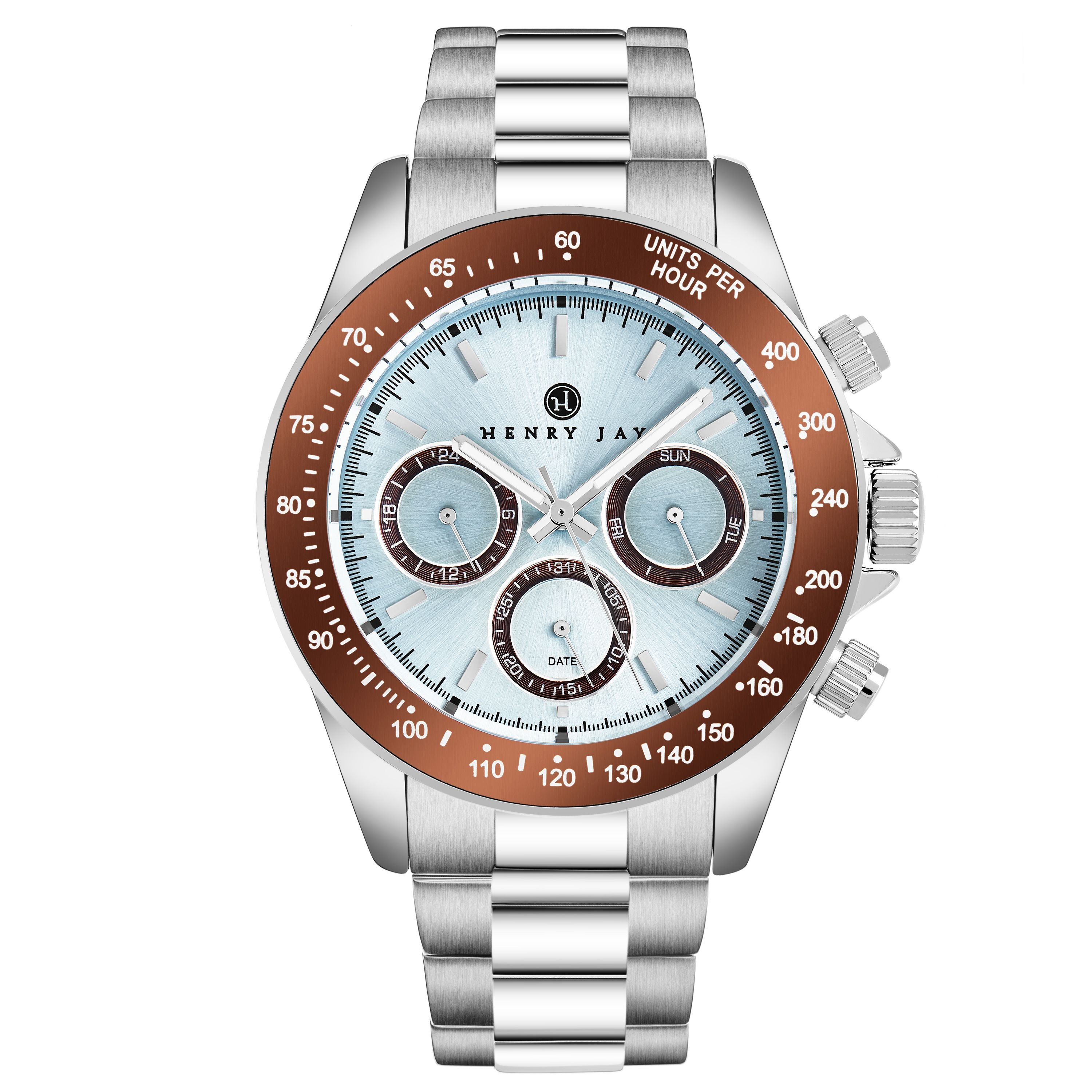 A classic sport watch from Henry Jay's Aquamaster series. It features a large round steel case and a robust stainless steel bracelet with polished center links and brushed outer links. The watch face has a blue dial with a GMT-Day-Date & Tachymeter display.