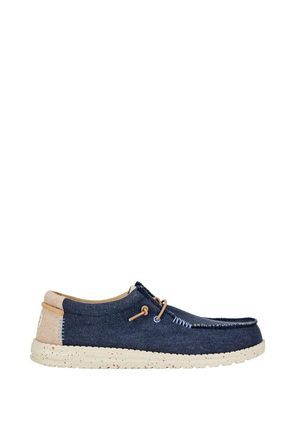 The HEYDUDE Men's Navy Jute Slip On Shoes is made from jute, canvas.