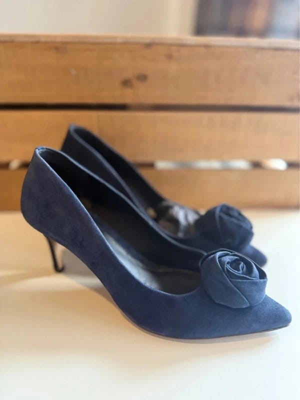 Elegant navy suede court shoes from Hobbs featuring a signature flower rosette detail. Perfect for adding a touch of refined drama to any occasion outfit.