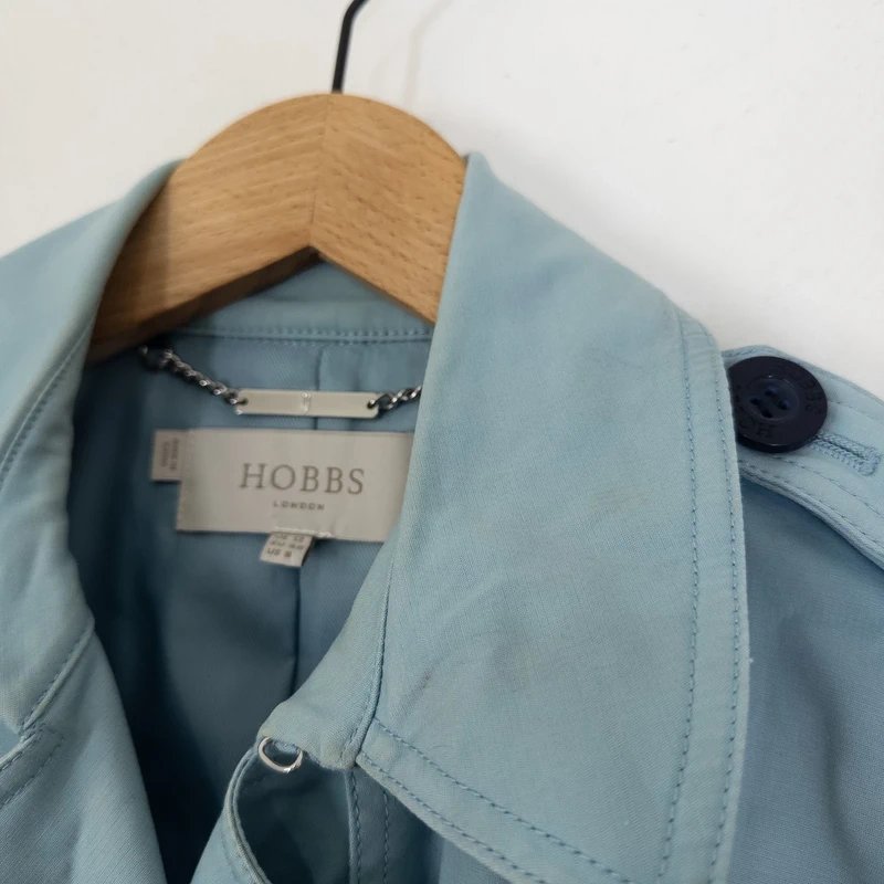 Light Blue Double Breasted Trench Mac Coat by Hobbs — the perfect blend of style and functionality. Designed in a light blue hue, this double-breasted trench coat features a classic mac style with a zipper closure. Crafted from lightweight cotton fabric, it offers a comfortable and breathable fit. Ideal for layering over your outfits, this coat is a versatile addition to your wardrobe.