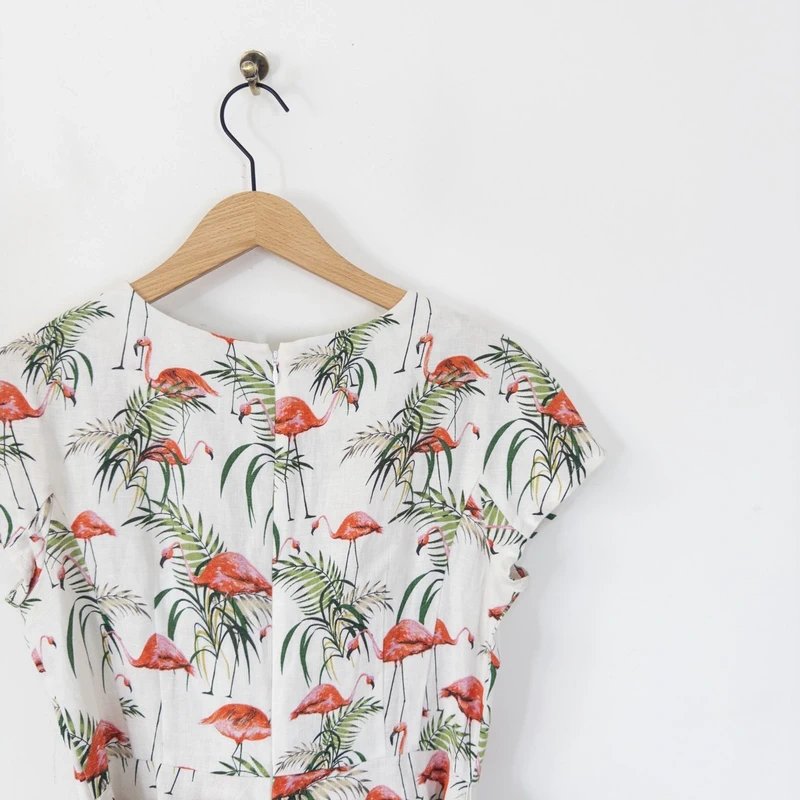 Crafted from 100% linen, this flared dress features an all-over flamingo print with a belted waist. The lightweight fabric makes it perfect for summer events and casual outings.