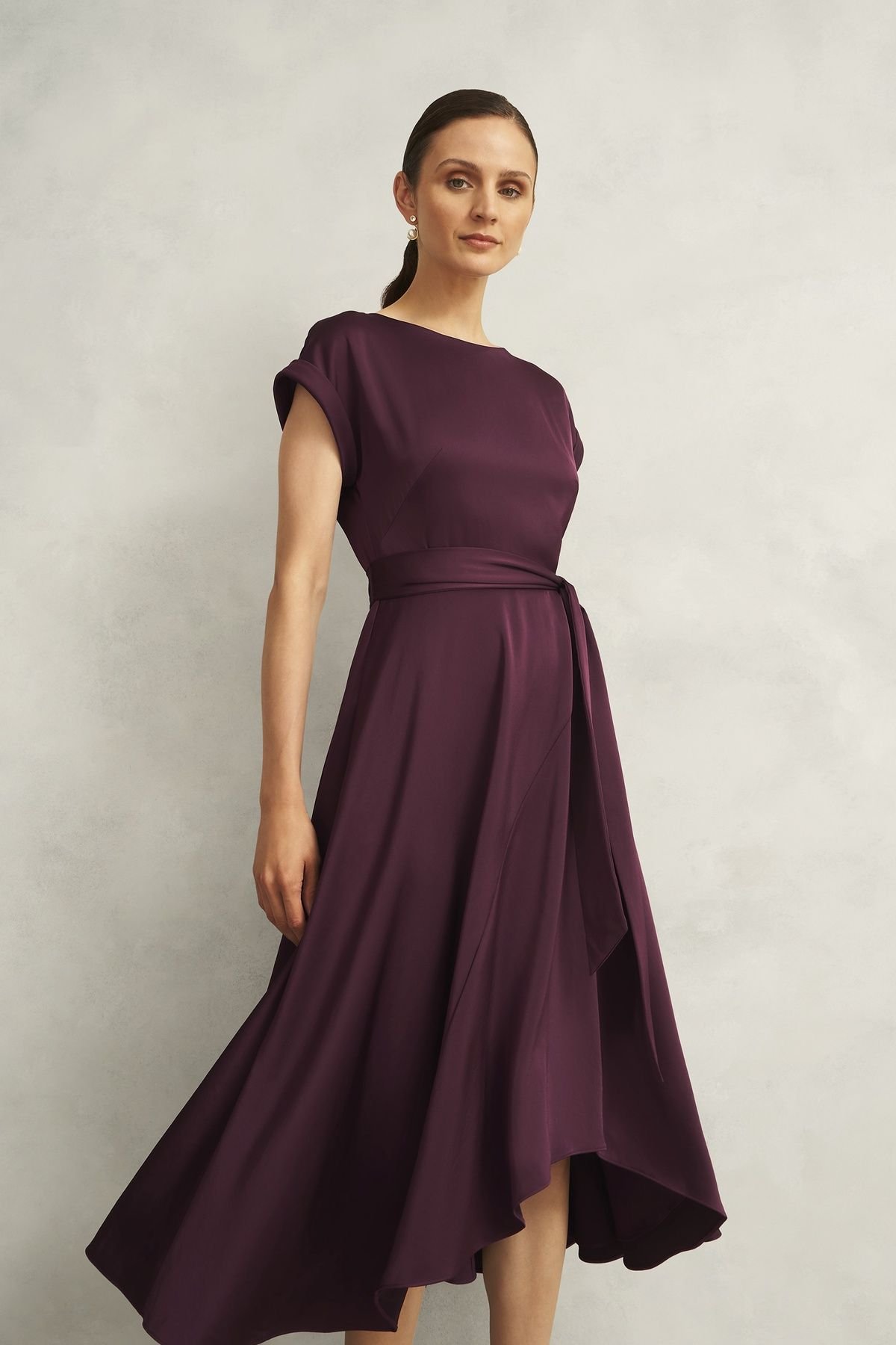 The Hobbs London Aubergine Satin Midi Dress is ideal for evening, date-night, party.