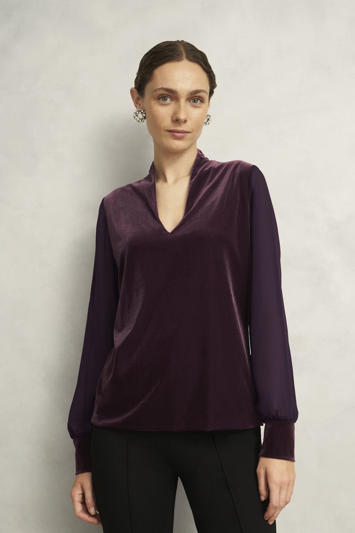 The Hobbs London Aubergine Velvet Long-Sleeve Top is made from velvet.