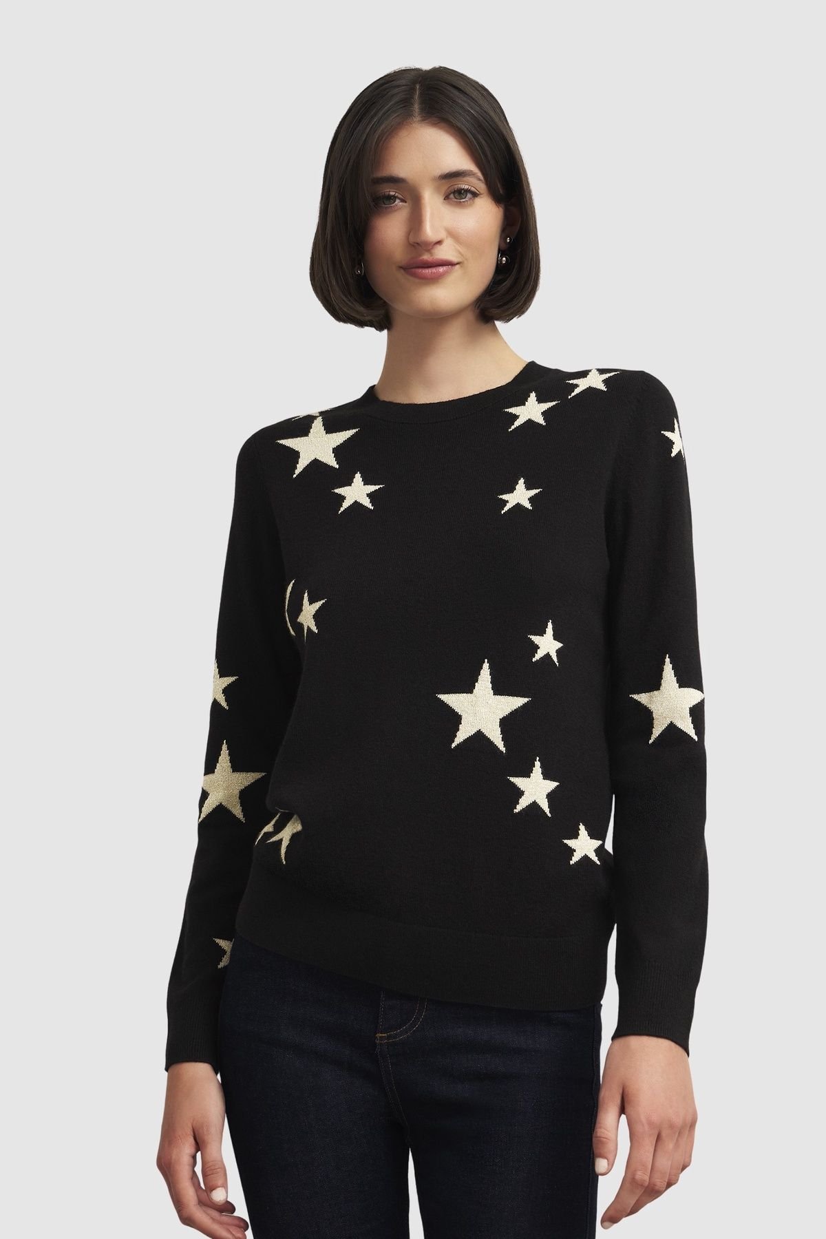 Sumptuous merino wool and cashmere blend jumper featuring celestial star jacquard, softly structured silhouette for relaxed evenings and weekend escapes.