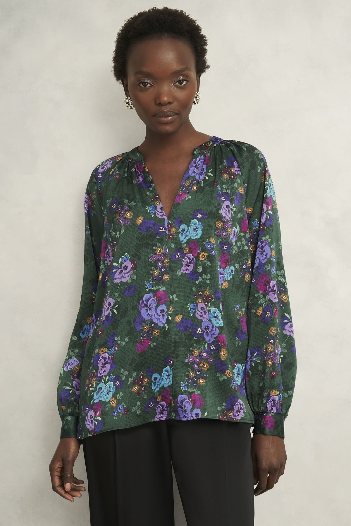 The Hobbs London Bottle Green Floral Print Blouse is made from satin.