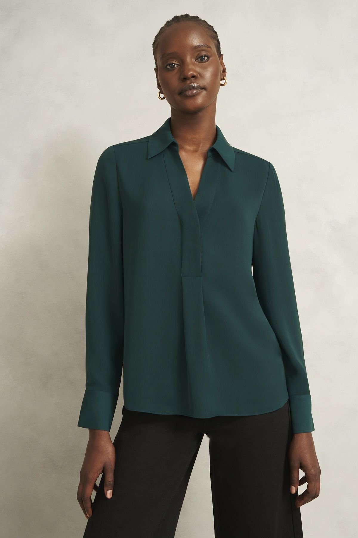 The Hobbs London Bottle Green Satin Blouse is ideal for casual, formal, work.
