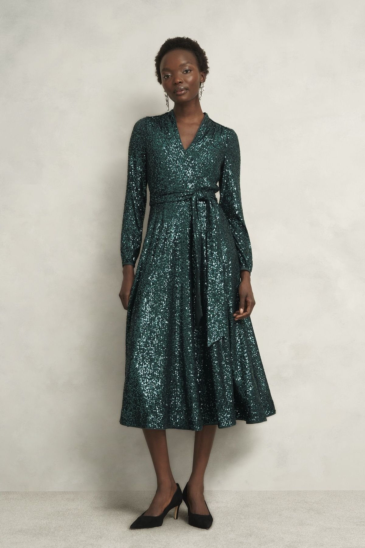 The Hobbs London Bottle Green Sequin Midi Dress is ideal for evening, party, special occasion.