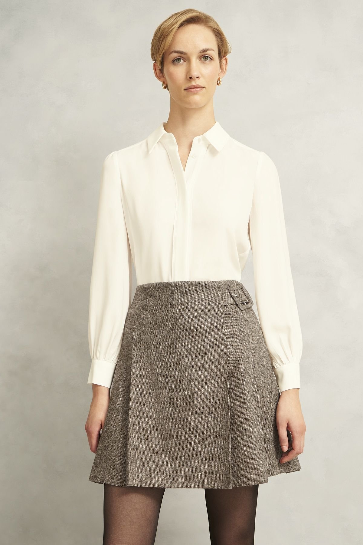 Chic pleated skirt in brown wool blend by Hobbs London. Features a modern silhouette and belted waist for a flattering fit. Ideal for both casual and formal settings.