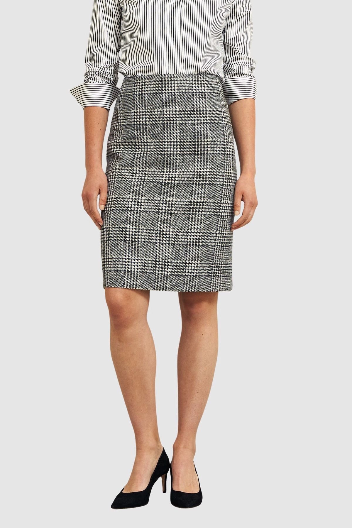 Sleek pencil skirt in charcoal wool with a high-waist design and subtle plaid pattern. Ideal for professional settings and evening outings.