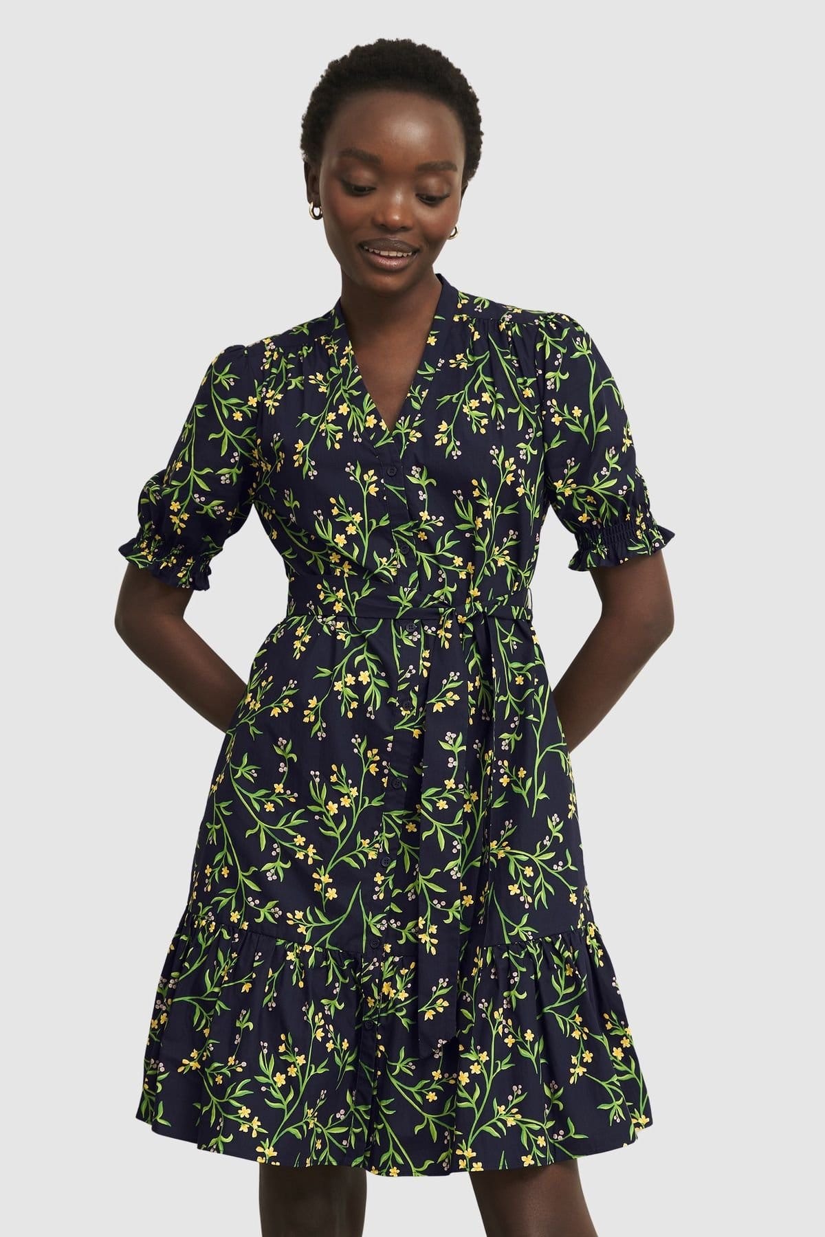 See all outfit ideasCharming mini dress in dark navy with a floral print. Features a V-neckline, short puff sleeves, and a fitted waist that flares out beautifully. Ideal for casual outings and weekend garden gatherings.
