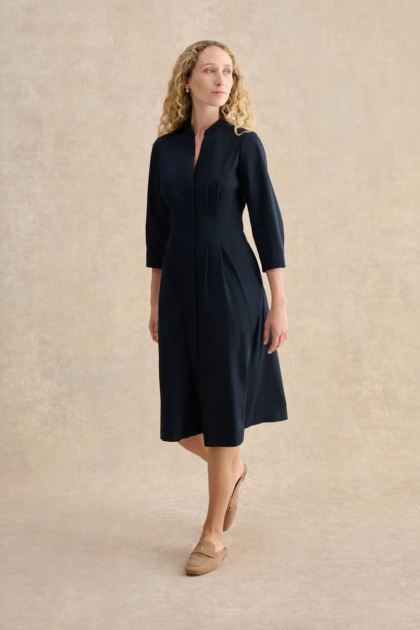 Stylish dark navy midi dress with a mandarin collar and 3/4 sleeves. Crafted for a fitted silhouette, this dress offers smooth drape and confident elegance, perfect for work or special occasions.
