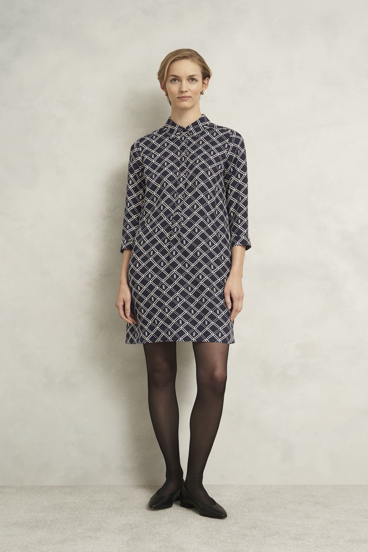 The Hobbs London Dark Navy Monogram Print Tunic Dress is available in sizes 10, 12, 14, 16, 18, 20, 22, 6, 8.