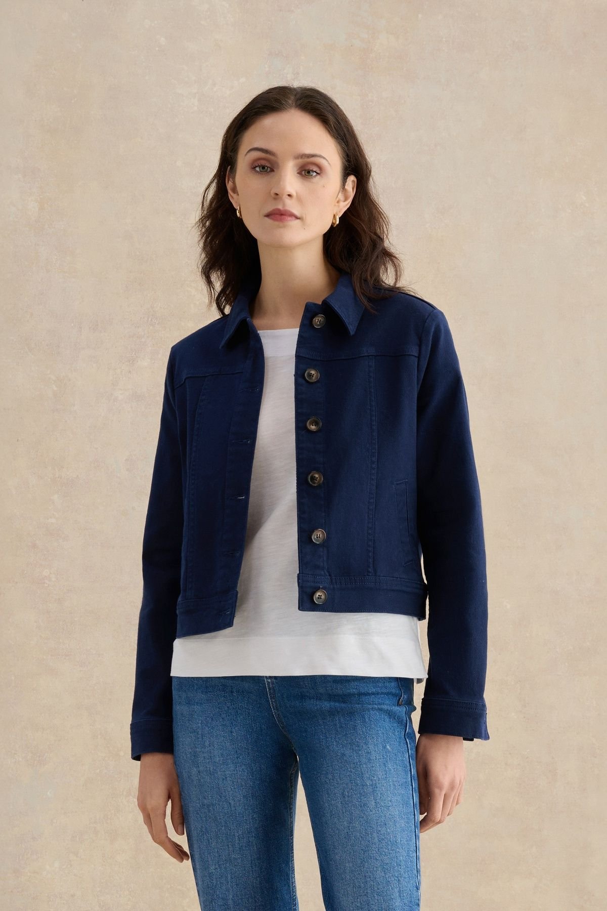 Stylish dark navy denim jacket offering soft stretch comfort and a boxy cropped silhouette. Ideal for city life and versatile for various occasions.