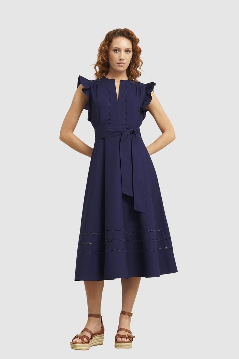 The Hobbs London Dark Navy Midi Dress with Ruffle Sleeves is made from cotton.