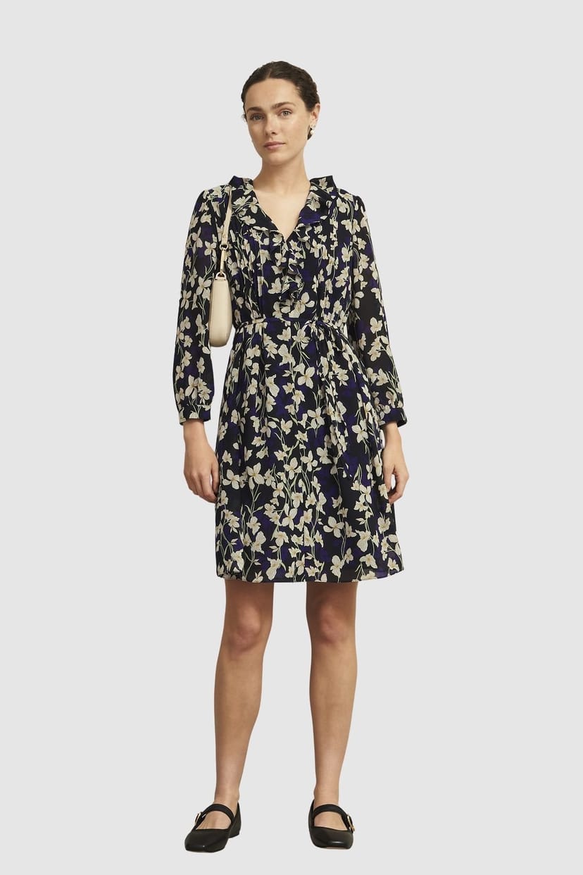View Debenhams's returns policyThis dark navy floral fit-flare dress by Hobbs London features a ruffled V-neckline, cinched waist, and a flowing skirt. Designed for both confident days and luminous evenings.