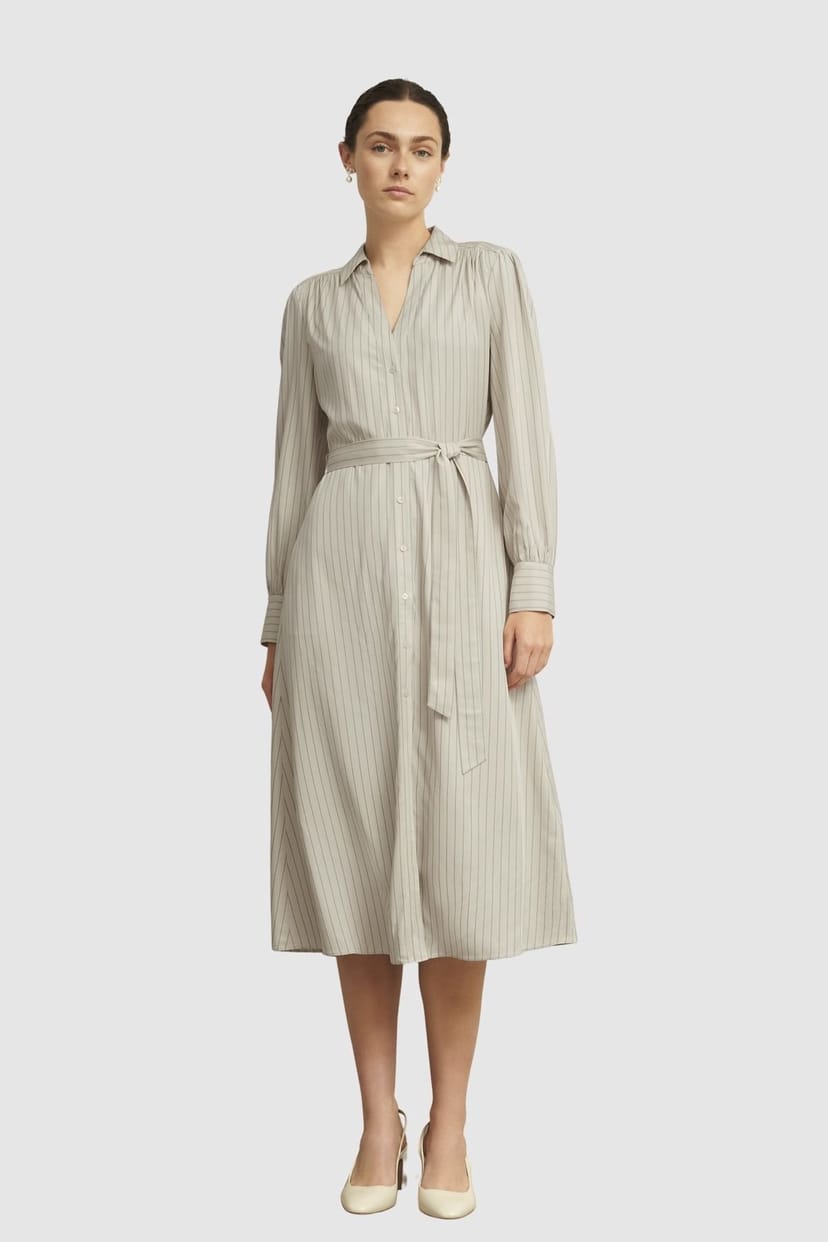 A softly draped midi shirt dress featuring a self-tie waist and subtle pinstripes, offering graceful movement and confident day to night wear. Perfect for versatile styling.