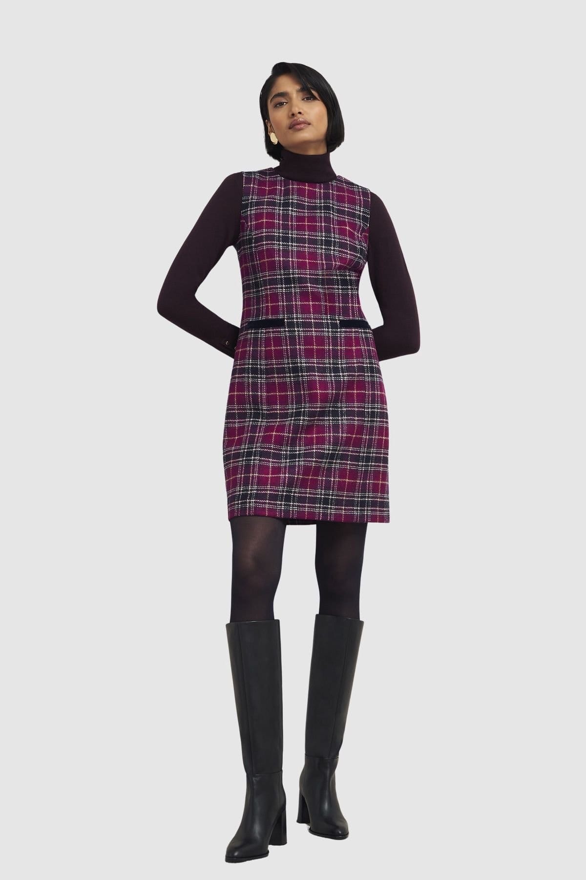 Versatile mini dress in a fuchsia checked pattern with a streamlined neckline and sleeveless design. Ideal for day to evening wear.