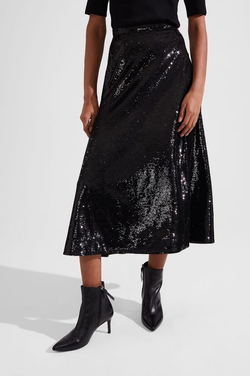 The Hobbs London Jet Black Sequin Midi Skirt is ideal for evening, date-night, party.