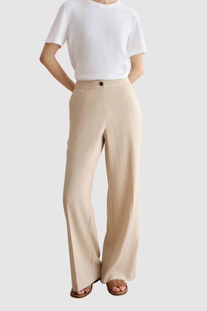 Stylish light beige pinstripe trousers with a wide-leg silhouette and subtle pinstripes. Perfect for a relaxed yet polished look.