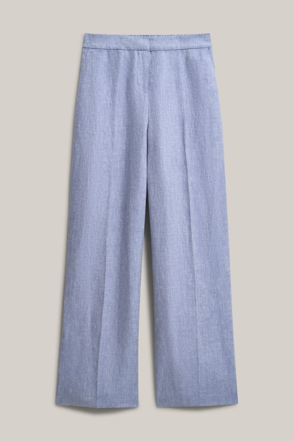 Stylish light blue linen wide-leg trousers with a mid-rise waist and meticulous tailoring. Perfect for warm-weather workwear and weekend ease.
