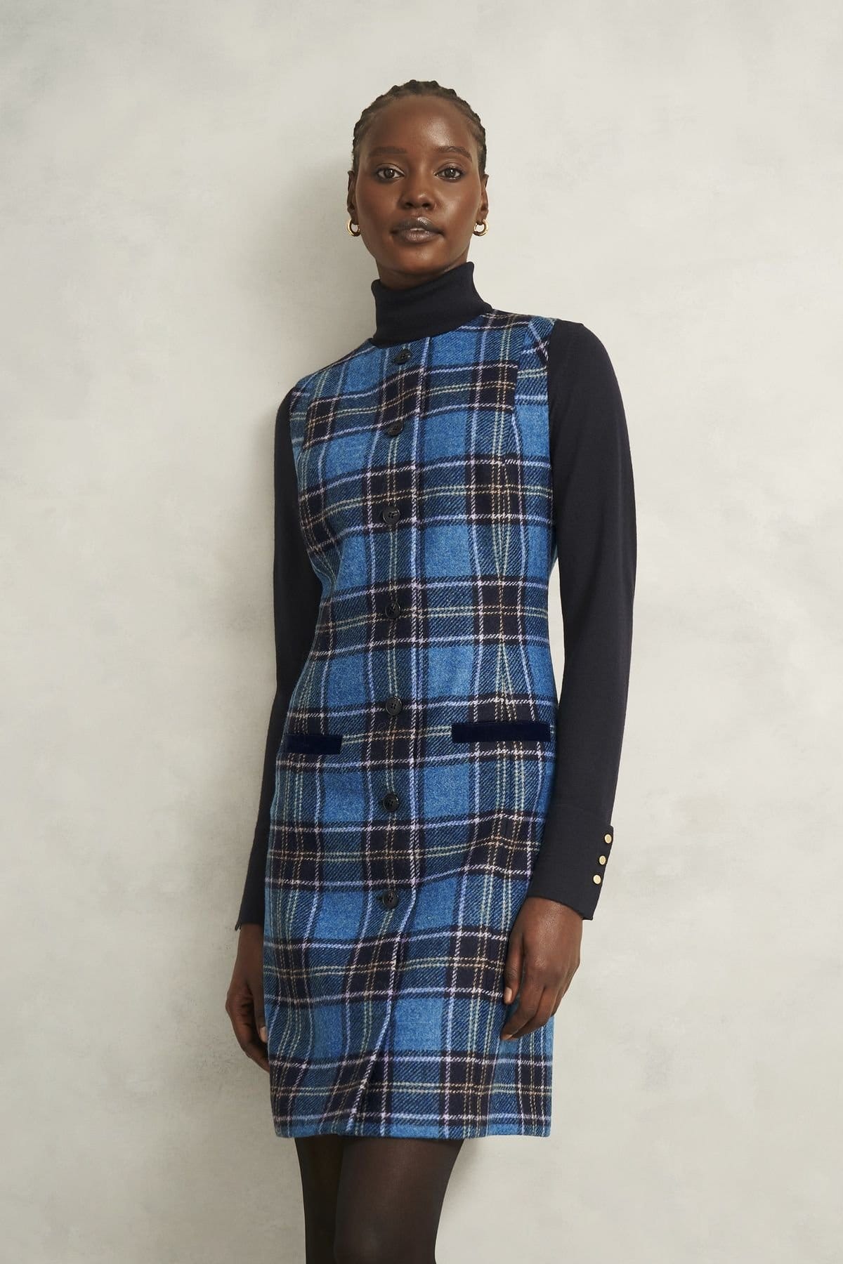 The Hobbs London Mid Blue Checked Wool Dress is available in sizes 12, 14, 16, 18, 20, 22, 6, 8.