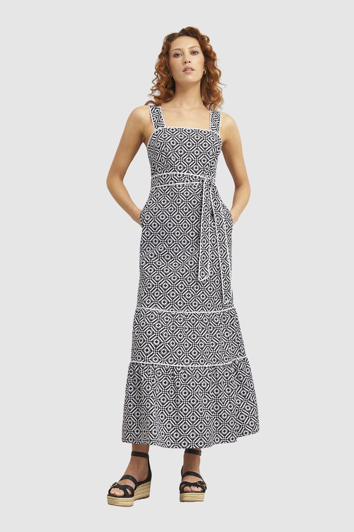 Stylish navy printed midi dress with a tie waist and square neckline. Features wide straps and convenient pockets for a perfect summer day look.