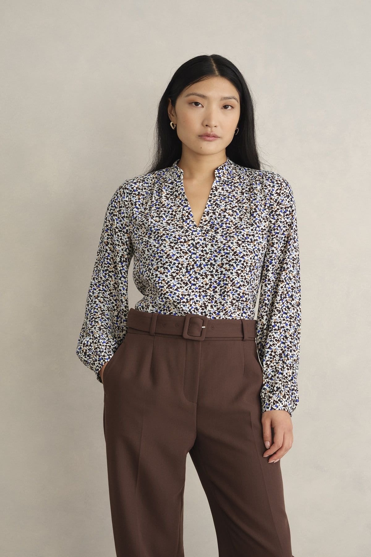 This off-white floral blouse by Hobbs London features billowed sleeves and a sculpted mandarin collar, creating graceful movement. The lightweight fabric drapes beautifully, perfect for confident workdays and sophisticated weekend moments.