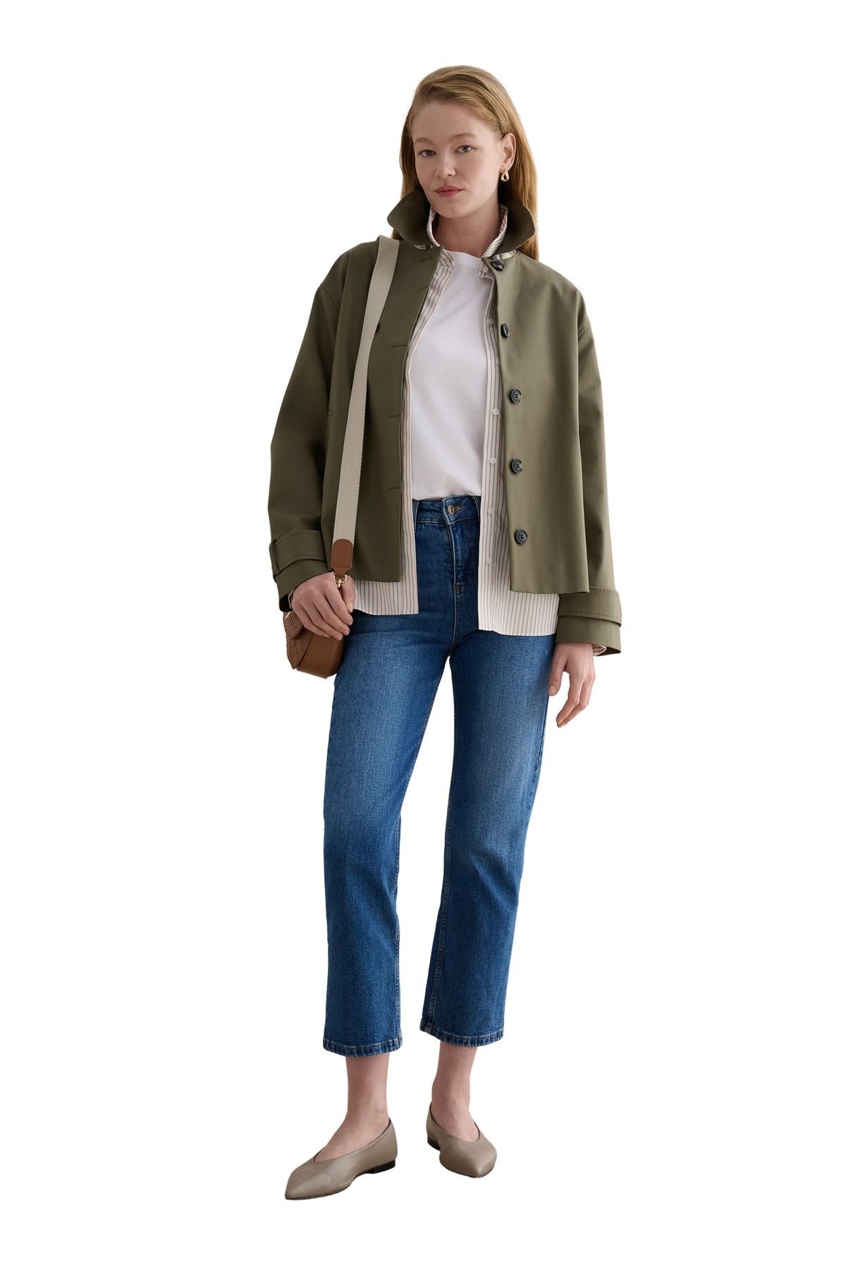 Sleek olive cropped trench coat with a collared neckline and button fastening. Designed for a lightweight drape and clean silhouette, perfect for urban and casual settings.