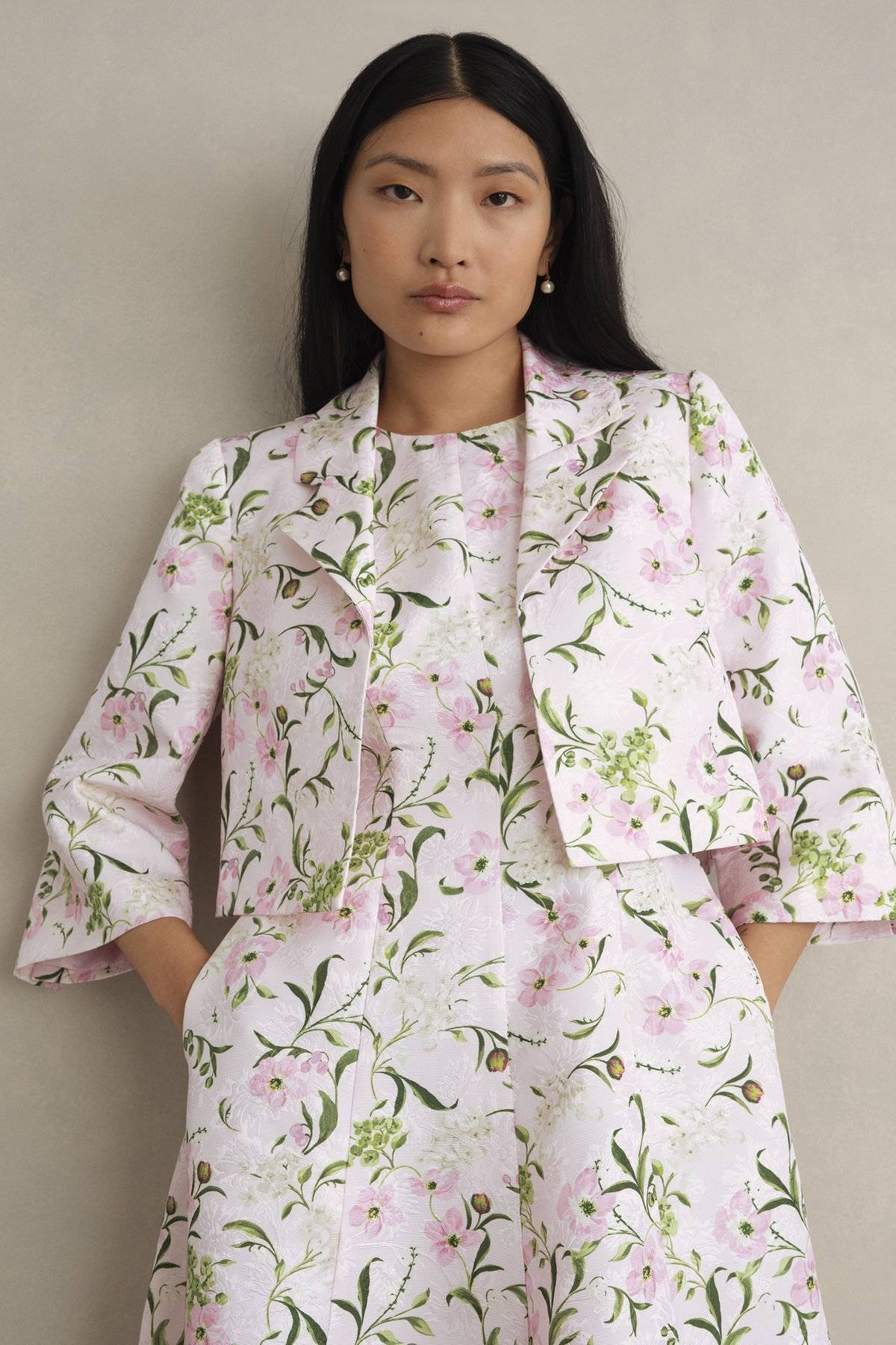 This pale pink floral cropped jacket by Hobbs London features a soft structured drape and a graceful silhouette. Ideal for wedding guests and garden celebrations.