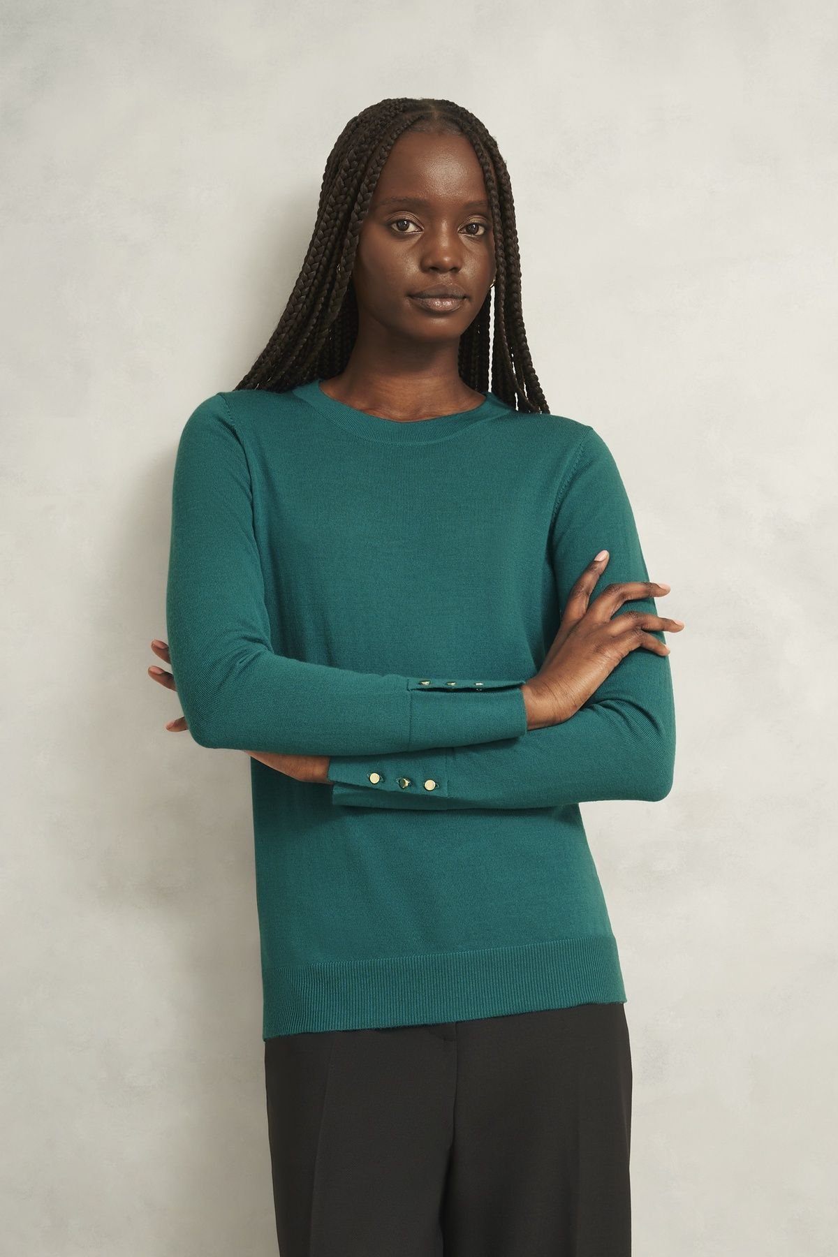 Stylish Teal Merino Jumper by Hobbs London, crafted from 100% Merino wool for a soft, warm feel. Features a crew neckline and ribbed cuffs for a classic look.