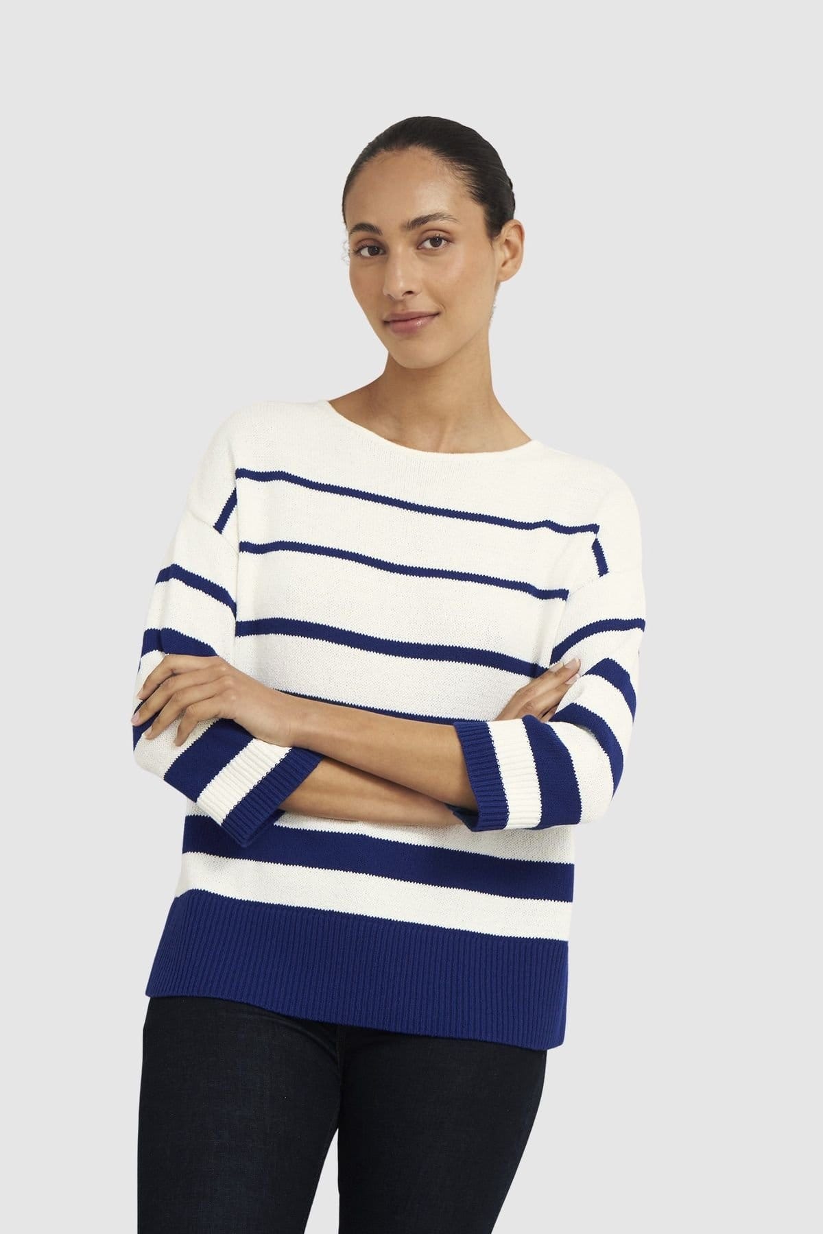 This boatneck jumper features a relaxed fit and three-quarter sleeves. The striped pattern adds a stylish touch, making it perfect for both casual and office wear.
