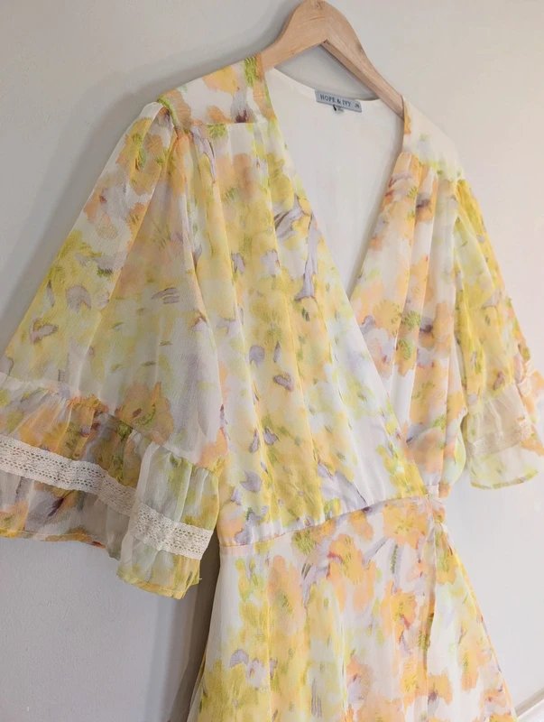 The Hope & Ivy Floral Print Wrap Dress in Yellow is available in sizes XXL.