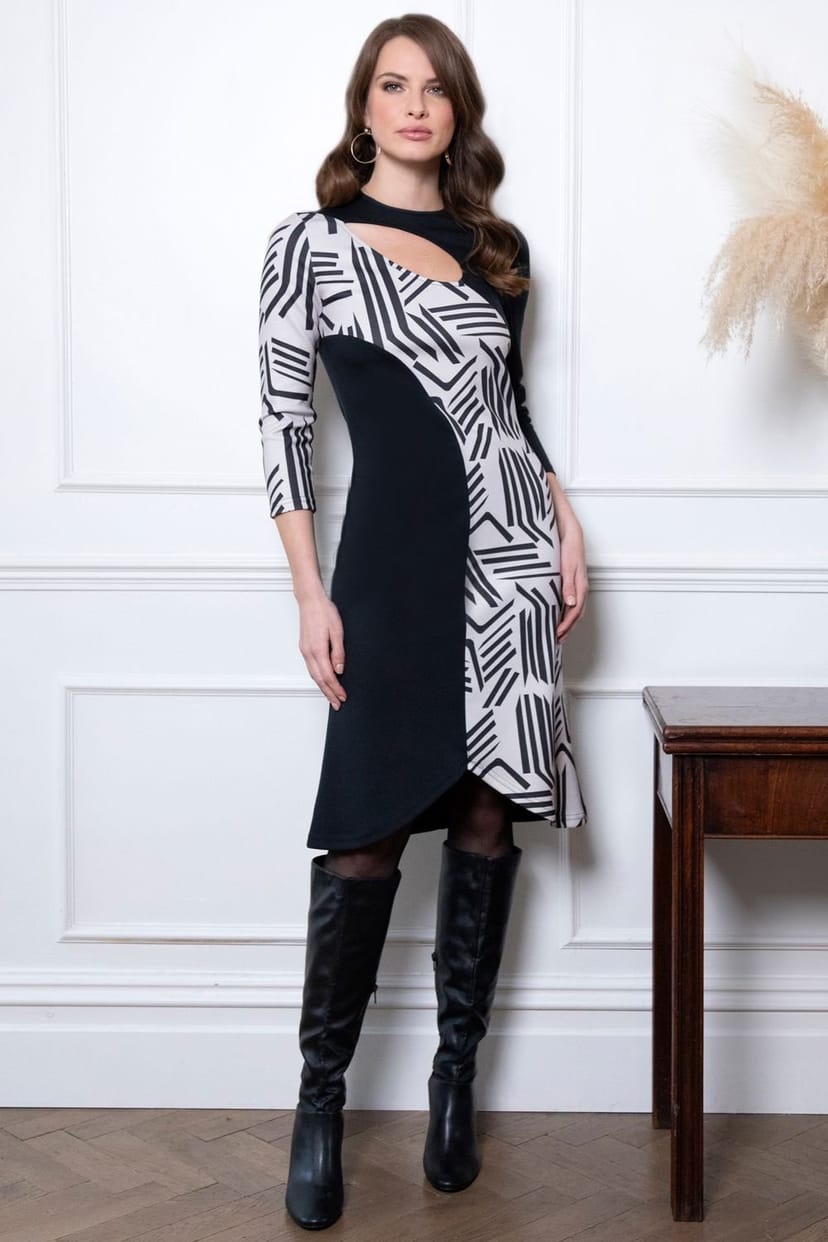 A striking black asymmetric keyhole dress with a unique pattern panel across the front. The tulip-style skirt adds a playful touch, perfect for transitioning from work to evening outings.