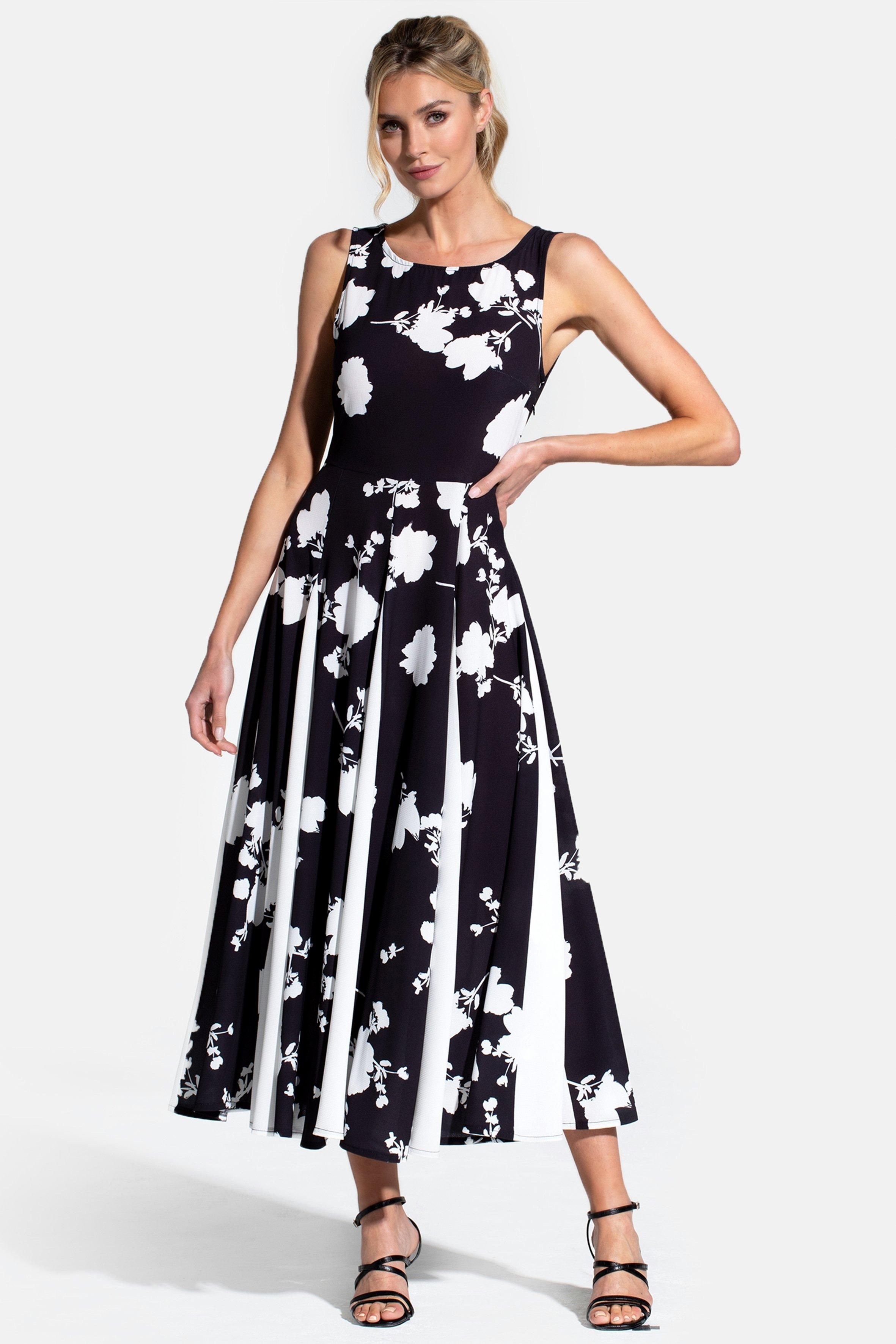 Stylish midi dress in black and white with a floral print and box-pleat detailing. Made from crease-resistant fabric, it's perfect for both evening events and office wear.