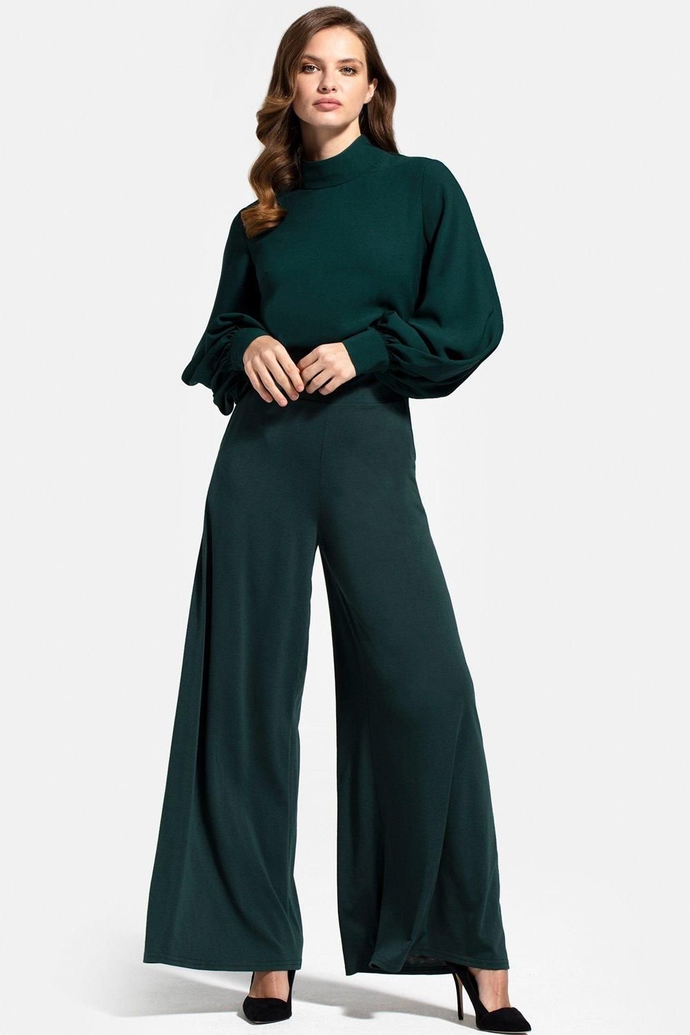 Elegant and sophisticated, this wideleg jumpsuit in green features a fitted waist and blouson sleeves. Easy-care fabric ensures comfort and style.