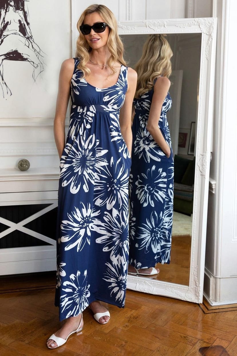 Elegant empire line maxi dress in light blue with a floral print. This sleeveless dress features a flattering shape, handy pockets, and is perfect for summer. Made from temperature regulating fabric.