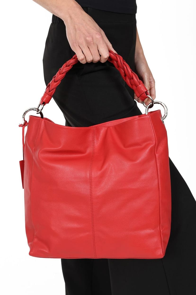 This chic red leather shoulder bag from HotSquash features a plaited detail handle and silver hardware. The bag boasts a magnetic clasp and an inside zip pocket, designed for a slouchy silhouette. Perfect for everyday elegance.