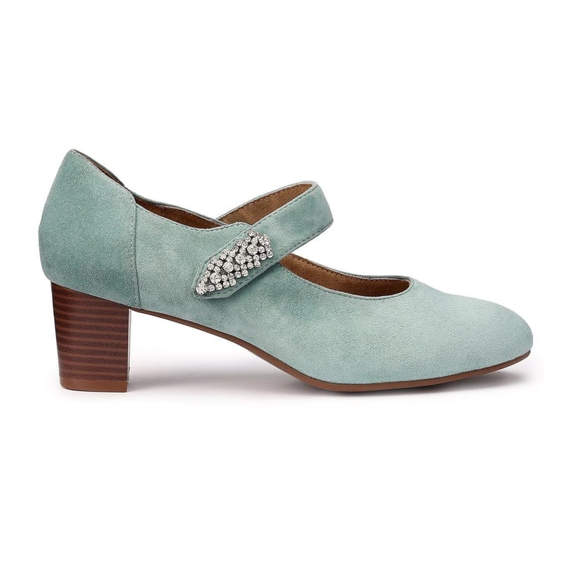 Classic heeled shoes in aqua suede with a low chic heel and rhinestone detail. Features an asymmetric bar and close fastening strap for easy adjustability. Perfect for formal events.