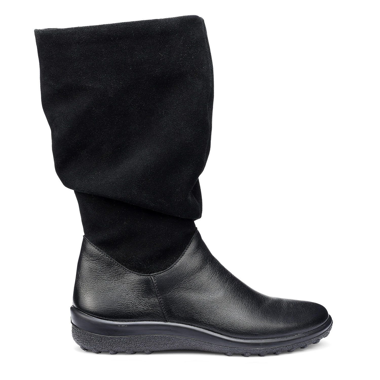 Versatile black boots combining leather and suede for a stylish look. Features a full-length inner zip and discreet elastic panel for a flexible fit. Equipped with energy-returning Cushion+ technology for all-day comfort.