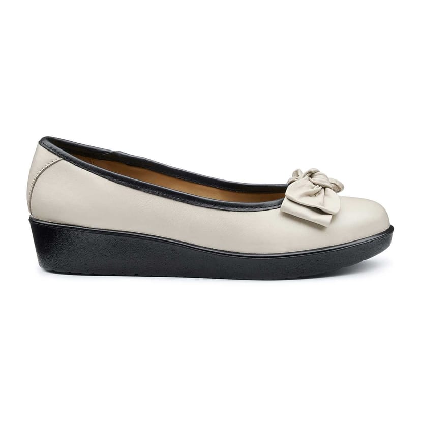 View Debenhams's returns policyThese light sand wedge pumps from Hotter feature a comfortable cushion sole and a decorative bow for a touch of elegance. Perfect for everyday wear with their stylish design and supportive fit.