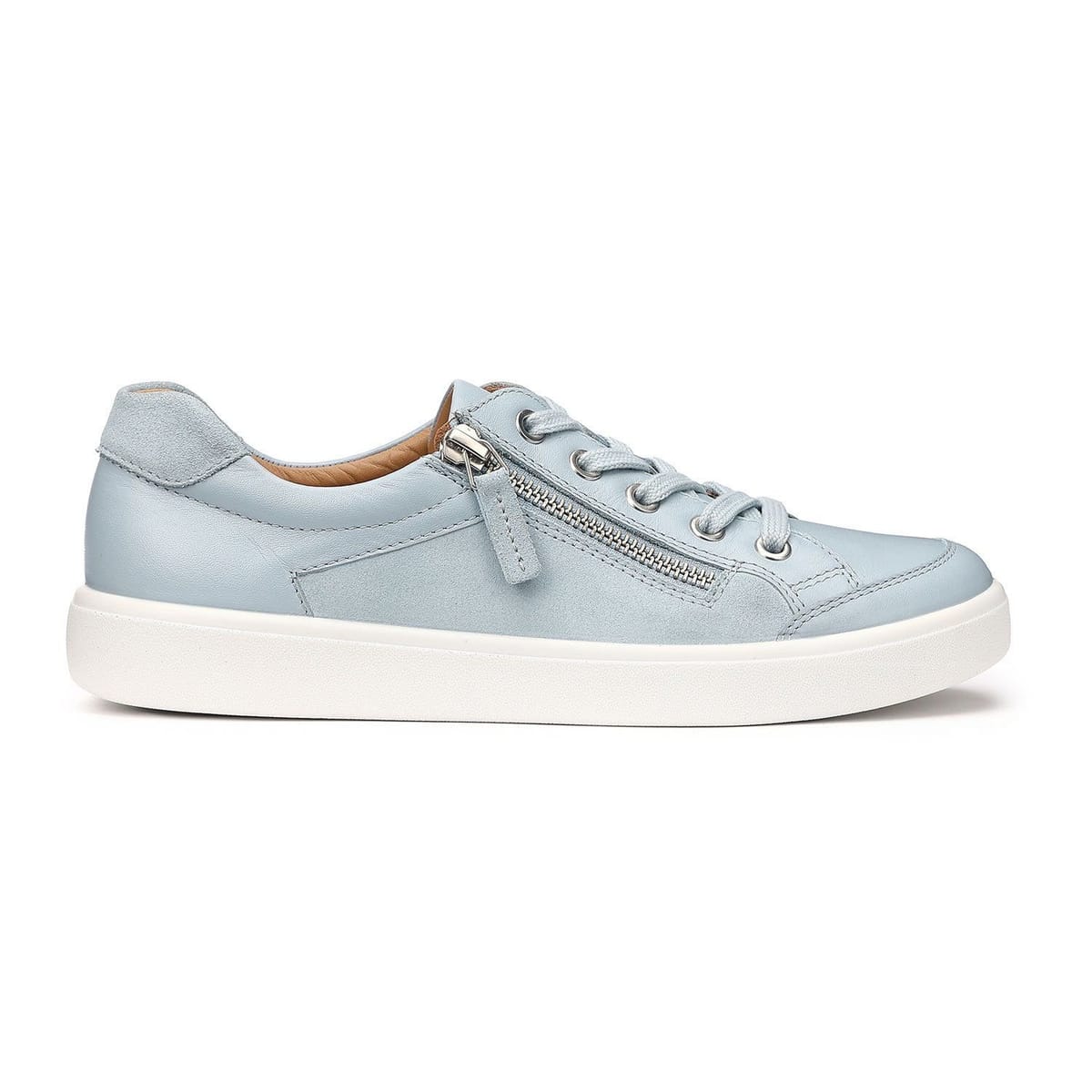 Stylish and comfortable Hotter trainers in pale blue with a leather-like finish. Features Integrated Cushion+ technology for reduced fatigue, a leather-covered insole with OrthoLite foam for extra comfort, and adjustable laces. Perfect for everyday wear.