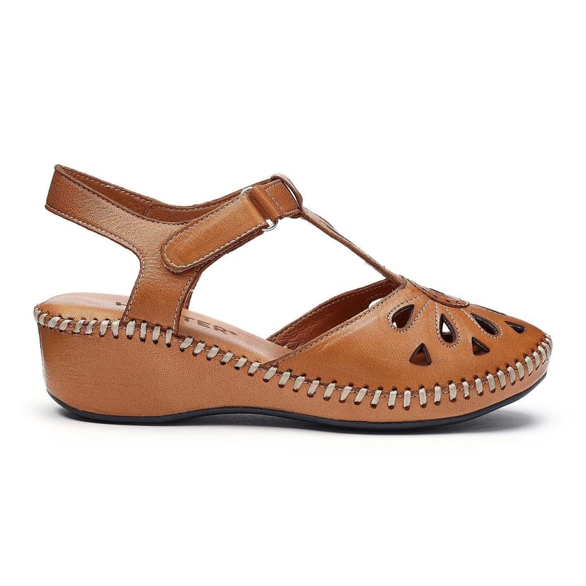 Chic wedge sandals in tan leather with a T-bar design and cut-out detailing. Features an adjustable ankle strap and rounded toe for a stylish, comfortable fit.