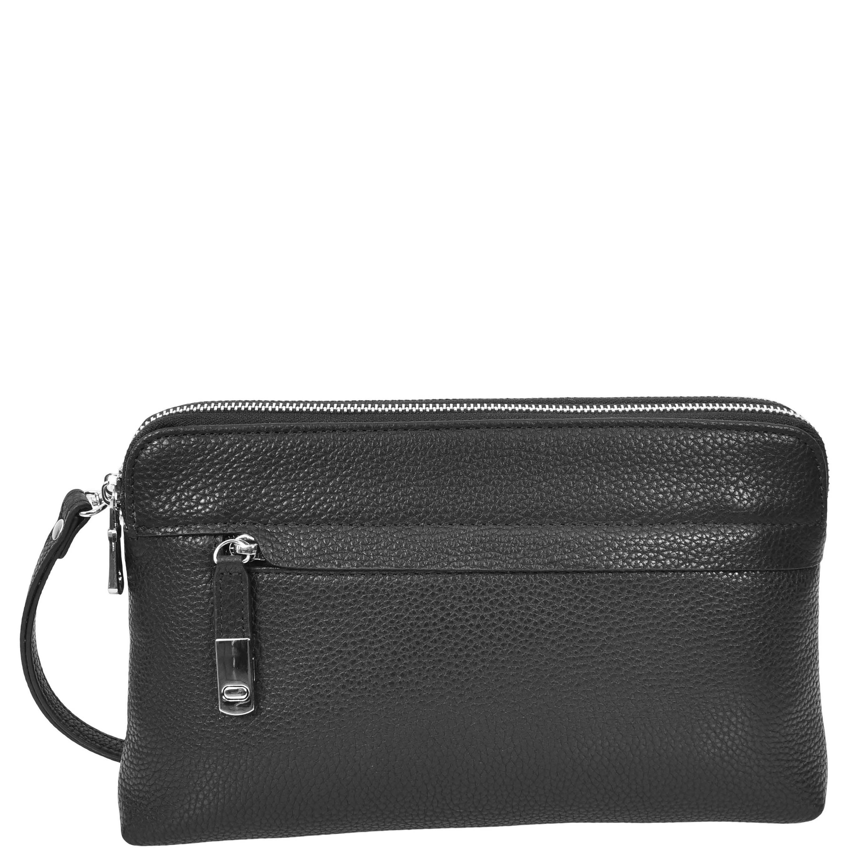 Sophisticated black leather wrist bag with a sleek modern design. Features a textured leather exterior, detachable wrist strap, and a zipper closure. Ideal for the modern gentleman.